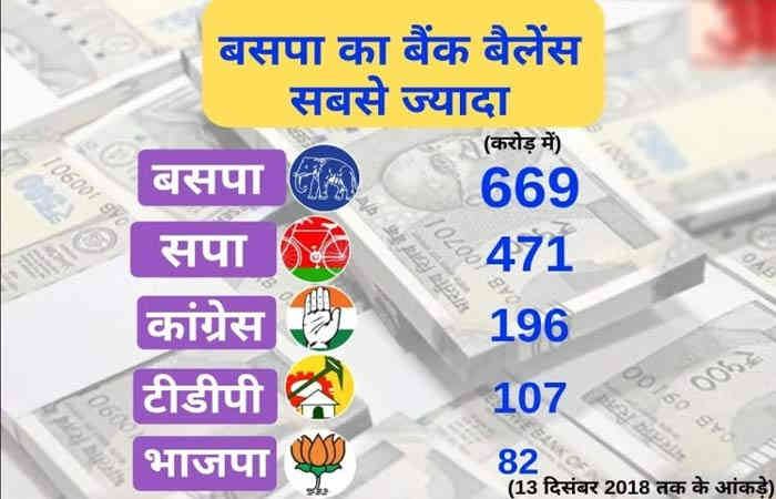 લોકસભાની ચૂંટણીના વાતાવરણમાં પ્રગટ થયેલી સત્તાવાર માહિતી મુજબ સૌથી વધુ પૈસા માયાવતીના બસપા પક્ષ પાસે છે. ખુદ બસપાએ 25 મી ફેબ્રુઆરીએ ચૂંટણી પંચને આપેલી માહિતી મુજબ એની પાસે 669 કરોડ રૂપિયા બેંક બેલેન્સ છે. બીજા ક્રમે મુલાયમ સિંઘ યાદવનો પક્ષ સપા 471 કરોડની બેંક બેલેન્સ સાથે આવે છે. કોઇને એમ લાગે કે કેન્દ્રમાં ભાજપનું શાસન છે એટલે ભાજપ પાસે વધુ બેંક બેલેન્સ હોવી જોઇએ. પરંતુ એવું નથી. આ યાદીમાં ત્રીજા ક્રમે કોંગ્રેસ પક્ષ છે જેણે ચૂંટણી પંચને જણાવ્યા મુજબ એની પાસે 196 કરોડ રૂપિયા બેંક બેલેન્સ છે. ચંદ્રા બાબુ નાયડુના તેલુગુ દેશમ પક્ષની કુલ બેંક બેલેન્સ 107 કરોડ રૂપિયાની છે જ્યારે છેક છેલ્લા ક્રમે આવતા ભાજપની બેંક બેલેન્સ ફક્ત 82 કરોડ રૂપિયા હતી.